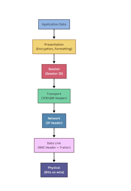 - Each layer wraps data like packaging an item.